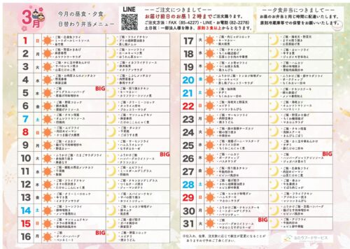 こちらのページでは、2026年3月度の昼食・夕食の日替わり献立表をご紹介いたします。